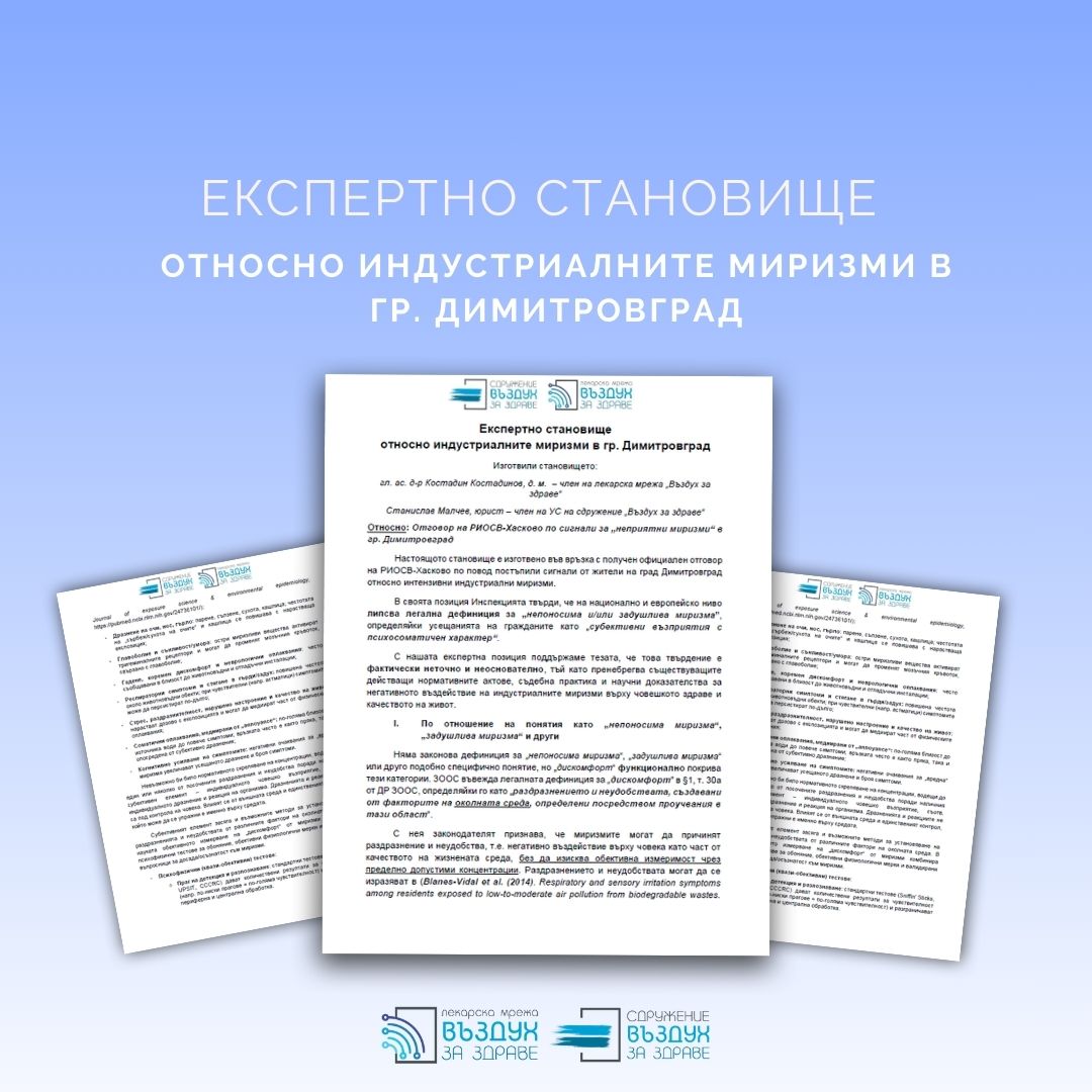 В публикуваното експертно становище, изготвено от д-р Костадин Костадинов, член на лекарската мрежа „Въздух за здраве“, и Станислав Малчев, юрист към сдружението „Въздух за здраве“, се посочва, че макар миризмите действително да се възприемат чрез сетивата, те са свързани с конкретни химични съединения във въздуха. В становището се отбелязва, че съществуват стандартизирани методи за определяне на миризми в атмосферния въздух, включително европейският стандарт EN 16841, приет и като български стандарт.